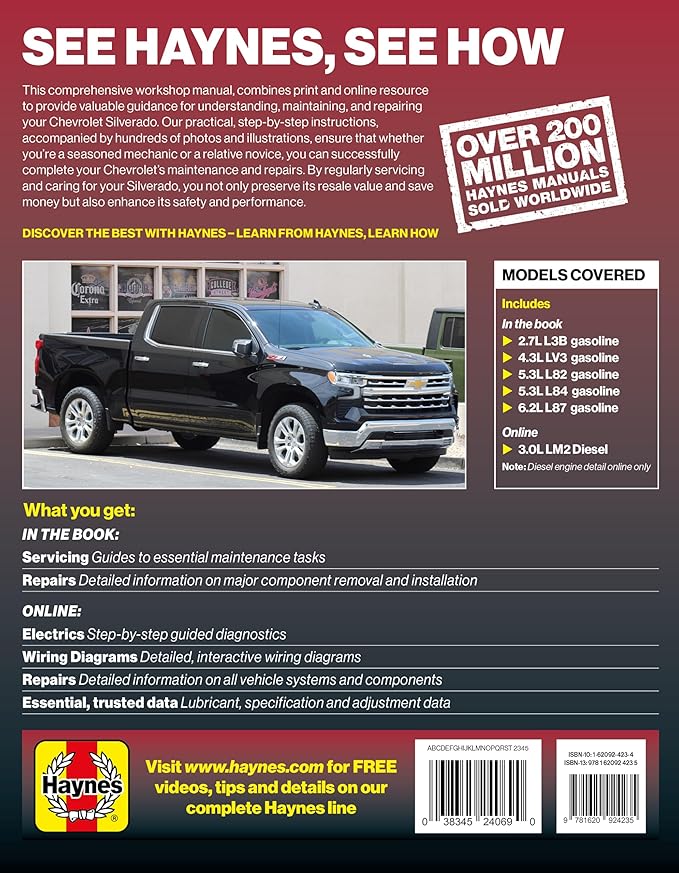 Haynes Chevrolet Silverado 1500 (2019–2022) Repair Manual: Covers 2.7L, 4.3L, 5.3L & 6.2L Gas Engines (in-Book) + Online-Only 3.0L LM2 Diesel – Maintenance, Repairs, Troubleshooting & Wiring Diagrams