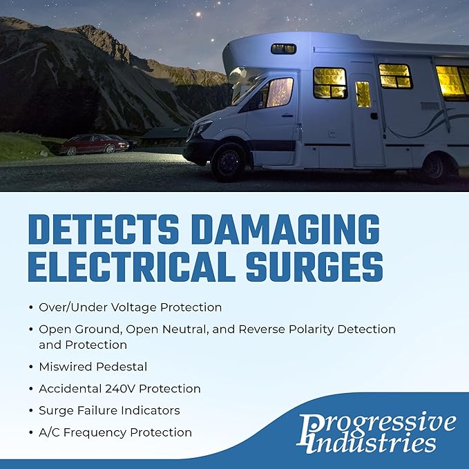 - ADVANCED FAULT DETECTION: Protects against over and under voltage, open ground and neutral, reverse polarity, miswired pedestal, accidental 240 V, surge failure, and AC frequency issues; designed for 50 Amp RV systems