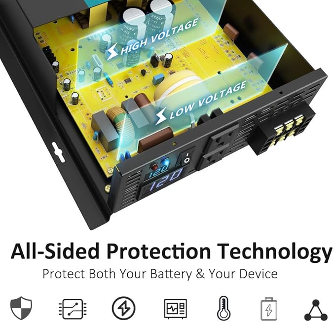 - Fully Safety Protections: Over voltage, Low voltage, Overload, Short circuit, Over heat, polarity reverse protection(fuse), Ground protection from leakage of electricity.