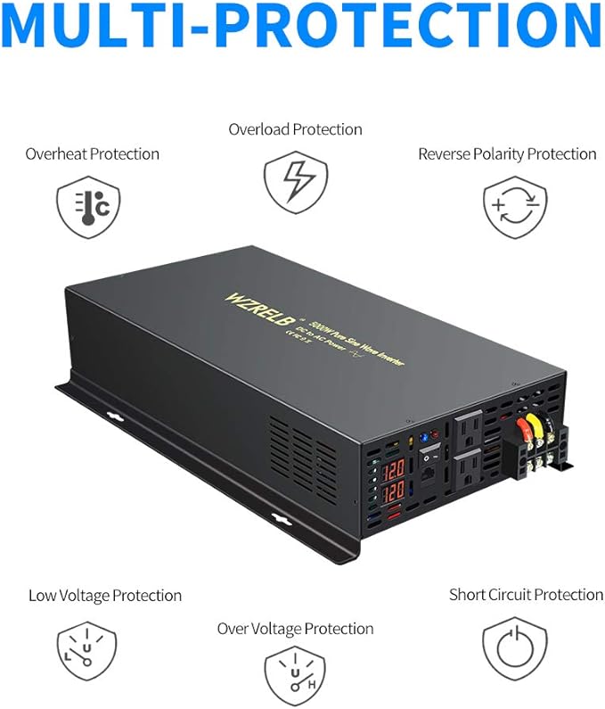 - WZRELB advantage: China's leading power inverter brand, provides 5000 watts continuous DC to AC power and 10000 watts instantaneous power, with LED displays for DC/AC voltages. Dual us outlets. 18-Months .