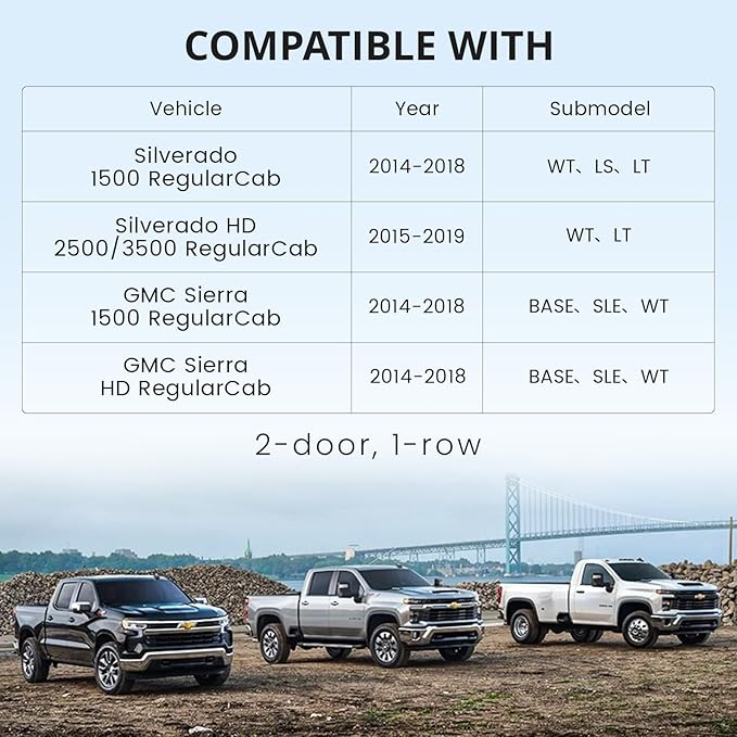 - Luxury Custom Fit: Car seat covers tailored for 1)2014-2018 Silverado 1500 RegularCab WT、LS、LT;2)2015-2019 Silverado HD 2500/3500 RegularCab WT、LT,2-door, 1-row. fits like a glove, sleek & stylish.
