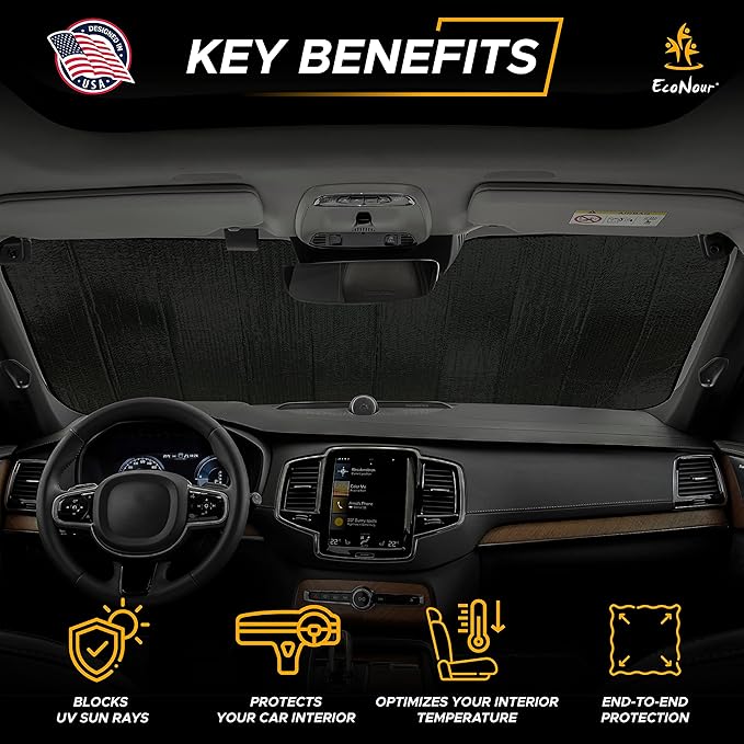 - Superior Sun Heat & UV Protection: EcoNour’s accordion sunshade for car windshield is designed to effectively block harmful UV rays, keeping your car's interior cool and comfortable. This car windshield sun shade works as a powerful car sun shade windshield that helps protect your dashboard from fading and cracking by reducing heat and sunlight exposure.
