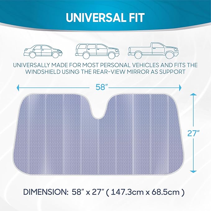 - 100% UV PROTECTION: Dual-Layer Bubble design for maximum protection for your vehicle's interior, this sun shade for car windshield will keep your seats and steering wheel cool by blocking the sun's heat and harmful UV radiation rays.