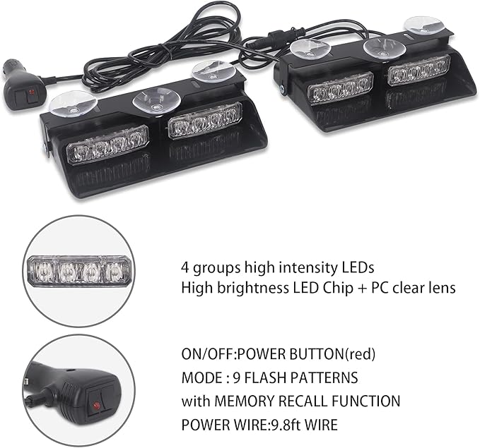 - HIGH-INTENSITY LEDs: This Windshield strobe light comes equipped with 16 High-Intensity LEDs will ensure your vehicle can’t be missed day or night. The flash light bar lifespan over 50,000 hour. Perfect for use in fog, rainy, snowy and mud wind season ideal and emergency situations, , durable and bright light.