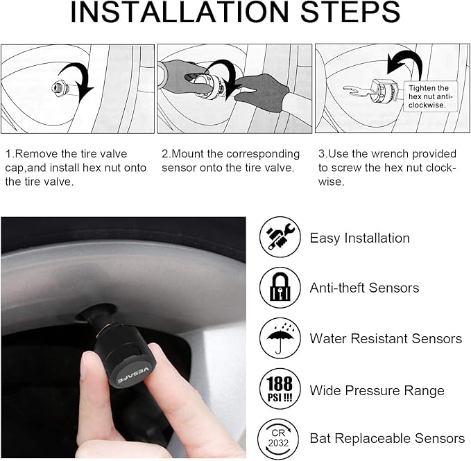 - ๐ใLow Power Consumption & Long LifespanใThe monitor supports driving up to 5,000 miles with a full charge. The tire sensors are anti-theft and durable with a battery life up to 2 years. The batteries are replaceable once used up.