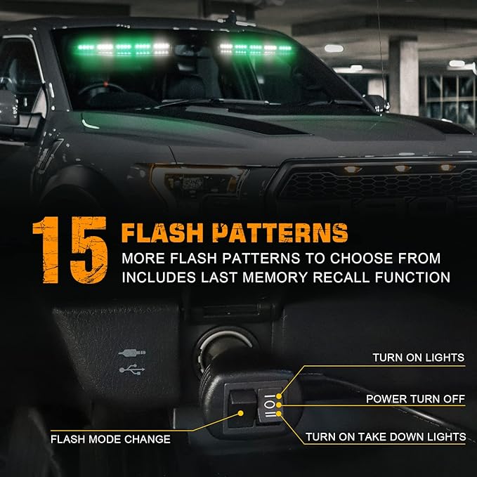 - 【15 FLASH PATTERNS】The interior emergency lights has take down. 12V cigarette plugs with a convenient dual-switch design. 15 selectable flash patterns, including the steady burning mode and last memory call function.