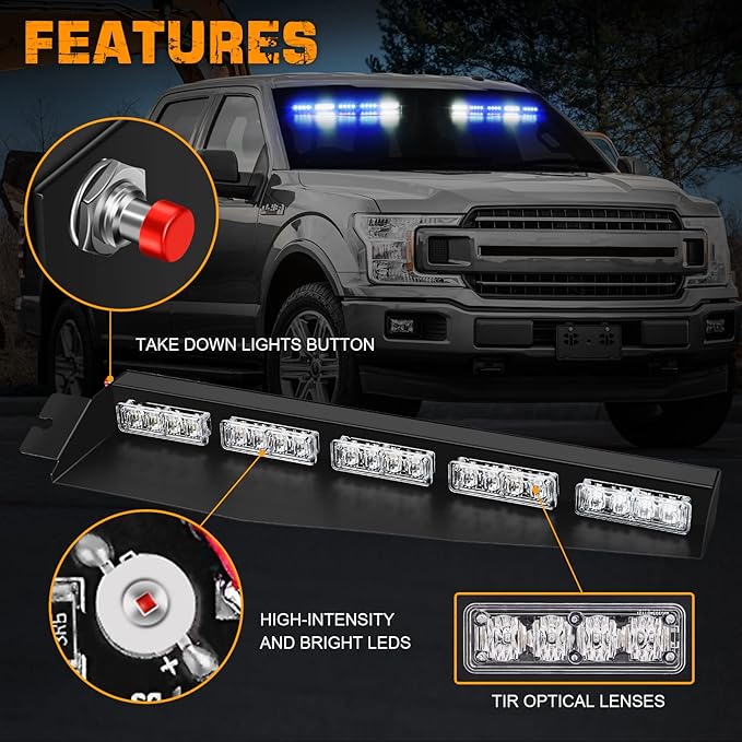 XRIDONSEN Blue White Emergency Visor Lights Warning Flashing Interior Windshield Strobe Lights Bar for Police Firefighter Vehicles Trucks w/Take Down, Deck Split Mount (34 inch, 40 LED)