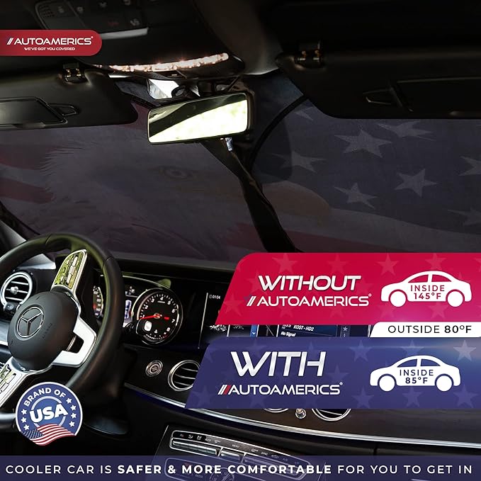 - Market-leading sun protection with an eye-catching American flag design. The new Autoamerics 1 piece USA windshield sunshades combines unbeatable sun reflecting and heat blocking capabilities. We achieve our market-leading protective performance by combining the finest reflective materials and innovative design to reflect the most scorching hot UV rays and heat.