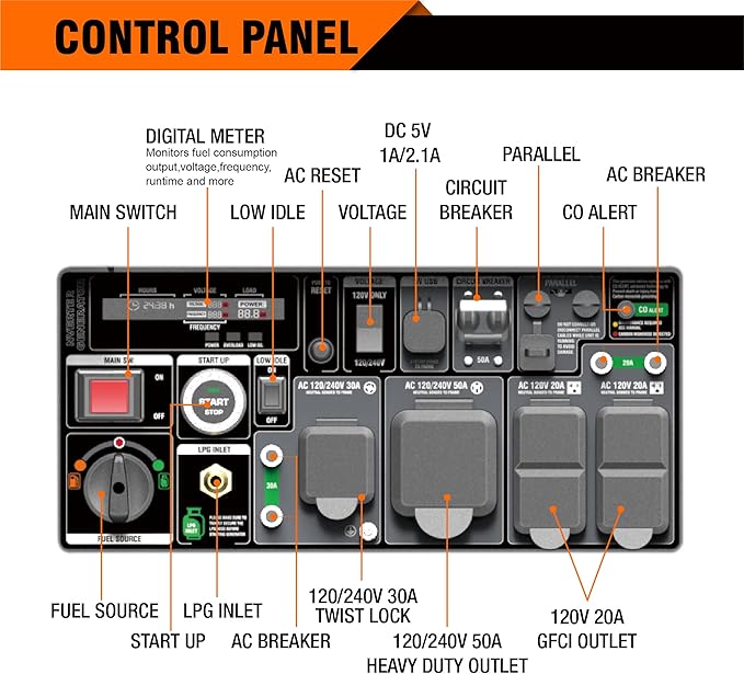 - 【 EASY TO CARRY AND USE】 Strong steel handle and 2 rolling wheels for easy travel; 5 in 1 Digital Data Center(Hours, Voltage, Loading,Gas fuel meter, Frequency) ,Remote Start With Key Fob.