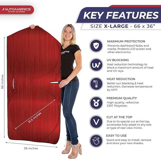 - Market-leading sun protection with an eye-catching Metallic Red design. The new Autoamerics 1-piece windshield sunshades combine unbeatable sun-reflecting and heat-blocking capabilities. We achieve our market-leading protective performance by combining the finest reflective materials and innovative design to reflect the most scorching hot UV rays and heat.