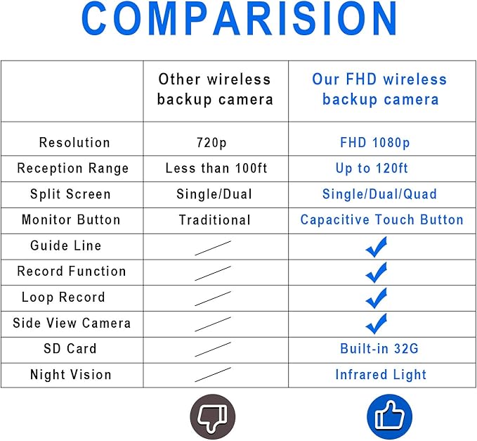 - 【Multi-View Monitoring & Recording】The wireless backup camera provides complete blind spot coverage on the passenger‘s side, ensuring zero blind zones during driving. It supports single, dual, triple, or quad split-screen viewing modes, allowing you to monitor multiple areas around your vehicle simultaneously. Equipped with a built-in 32GB SD card, the system automatically records driving footage and overwrites the oldest files with loop recording, keeping your journeys documented and secure.