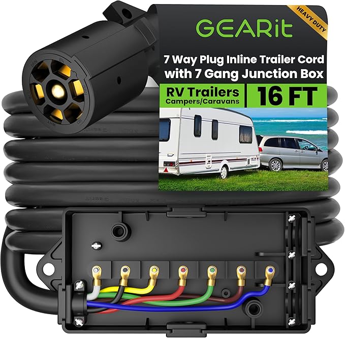 GEARit 7 Way Plug Inline Trailer Cord (16 Feet) with 7 Gang Junction Box - Weatherproof Wiring Harness Cable with Waterproof Junction Box for RV Trailers and Campers - 16Ft