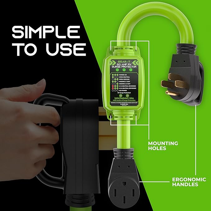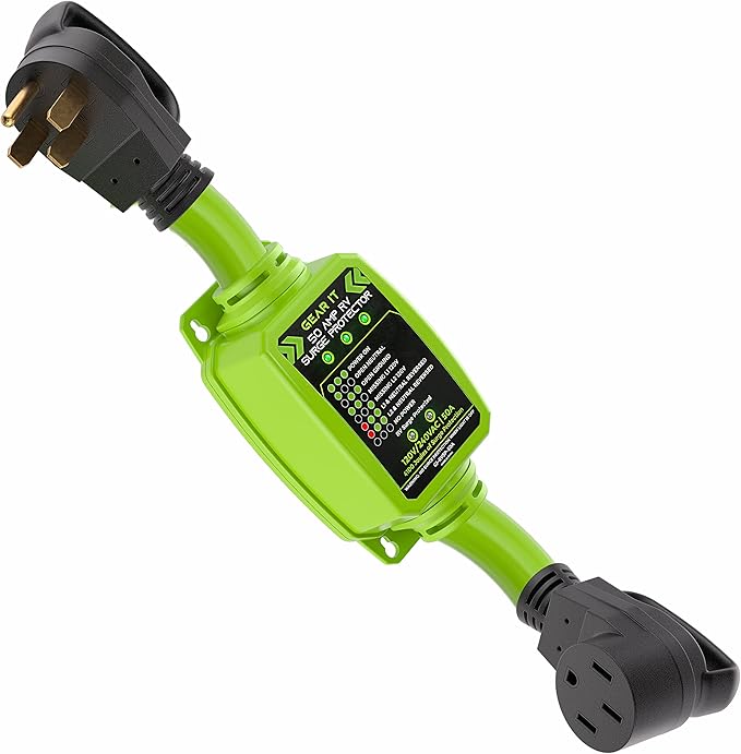 - Keep your recreational vehicle safe and protected - GEARit RV Surge Protector 50 AMP. This powerful surge protector is designed to protect against high/low voltage, reverse polarity, and open ground, ensuring that your RV is always safe to use. Before plugging in your RV, check the stable current LED to ensure a safe connection.