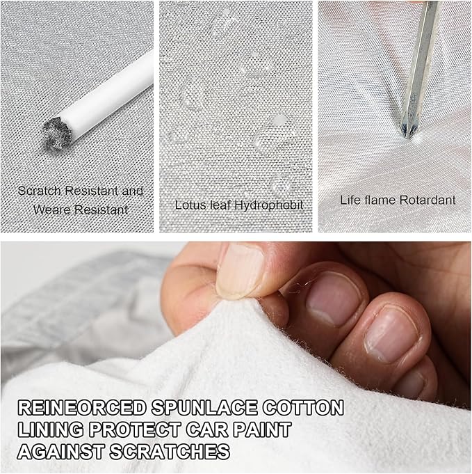 - 【COMPLETE PROTECTION】- No matter hot sun or cold weather. All weather car covers can handle it all. The powerful material keeps your car safe from uv rays, sand, dust, leaves, branches, snow, rain, frost, birds dropping. Important: Always apply the car cover to a completely dry vehicle. Avoid use on wet cars to prevent moisture buildup