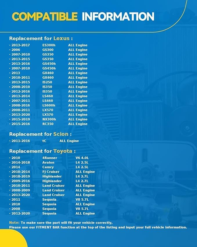 - [Compatible Vehicle] The ignition coil pack is compatible with Toyota: 2010-2013 RAV4 2.5L, 2014-2018 RAV4, 2010-2016 Camry 2.5L, 2017 Camry, 2007-2008, 2011-2012, 2016, 2018 Tundra 5.7L, 2010-2012 Tundra 4.6L, 2011 Tundra 4.0L, 2013-2015, 2017, 2019-2020 Tundra, 2008, 2011 Sequoia 5.7L, 2010, 2012-2020 Sequoia, 2009-2015 Venza 2.7L, 2010 4Runner 4.0L, 2011-2020 4Runner, 2009-2016, 2018-2019 Highlander 2.7L, 2010-2014 FJ Cruiser, 2014-2018 Avalon 2.5L, 2011-2012 Sienna 2.7L, 2008-2011, 2013-2020 Land Cruiser