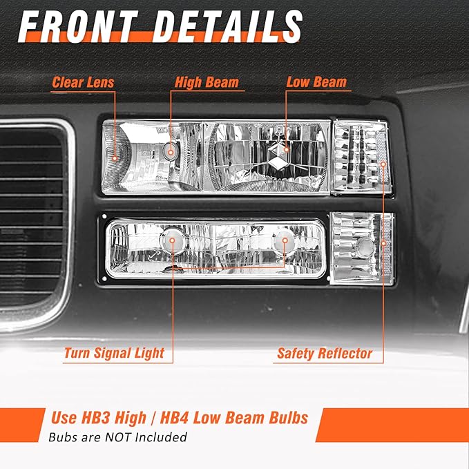- Vehicle Compatibility: Headlights assembly compatible with 1994-1998 Chevrolet C/K /C10 1500/2500/3500/1994-1998 Chevrolet Silverado/1994-1998 Chevrolet Tahoe/Suburban;DO NOT FIT GMC MODELS!
