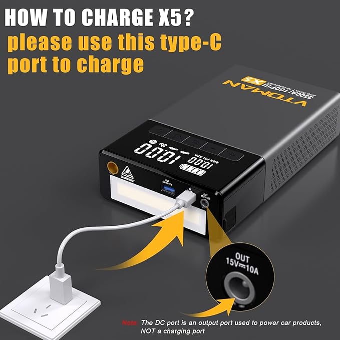 - *Note:Type-C is the only input charging port. The DC output port is used to power car products such as car vacuum cleaners, not an iutput port. Please use type-C cable to charge. Improper charging may cause safety issues.