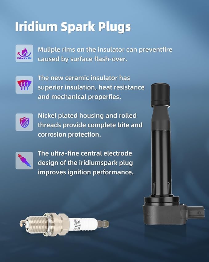 - Enhanced Coil and Spark Plug : Upgrade 15% more energy than OE coils and improve engine performance. TheIGNITION coils provide spark for your engine. Over time your factoryIGNITION coil and plugs will fail leading to poor gas mileage, misfire, hesitation, check engine light (CEL) and VSC warning lights, please replace your coils and plugs together to provide superior cold - start performance and a smoother running engine