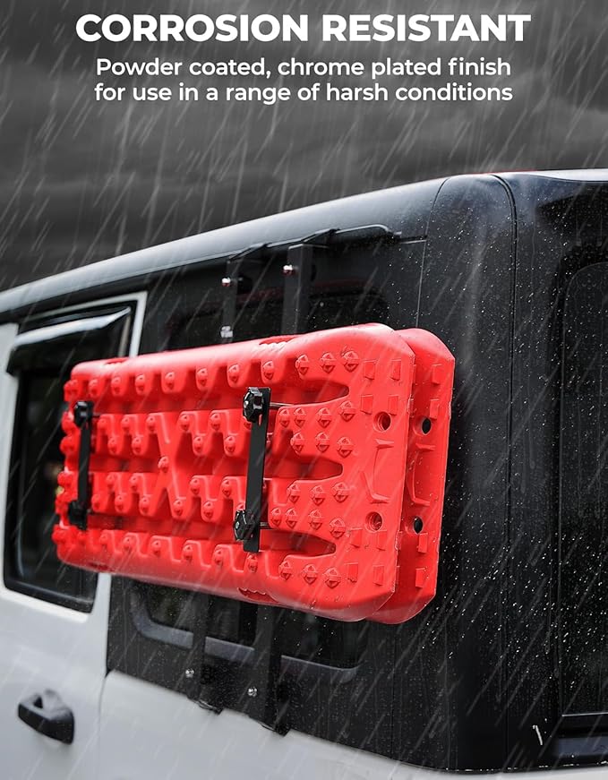 - 【Stable and Secure】Travel confidently even on mountainous or bumpy terrain. Our Wrangler gas can and recovery board mount holders securely hold up to 60 lbs of gear. Please note that the driver's and passenger's rearview mirror view may be slightly obstructed