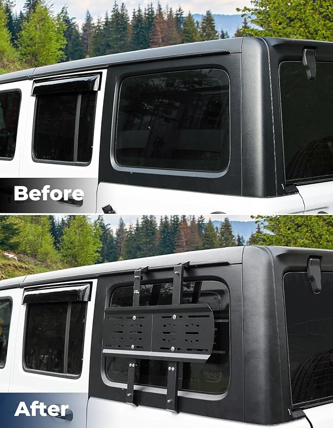 - 【Optimize Space】Maximize your storage space with these rear side window Wrangler gas can holders. Mount your gasoline pack and recovery traction boards with ease and without compromising the opening and closing of your rear door. Note that the gas pack mount lock is not included