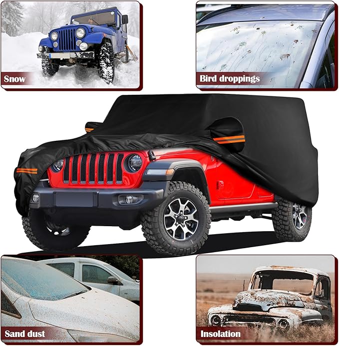 - APPLICABLE MODELS: Cover size 490x190x150cm / 193"x74.8"x59"(L*W*H). SUV car cover for Jeep Wrangler 4 door JK JL, 2006-2025