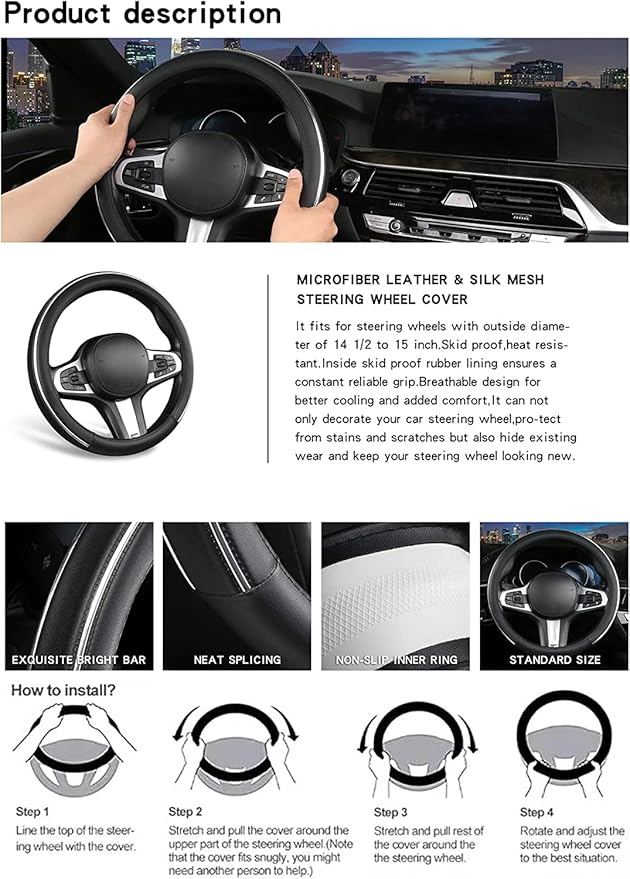 - ππππAnti-slip and protection: This steering wheel cover consists of microfiber leather and silver fiber anti-slip strips to give you a better grip on your steering wheel. It also allows your steering wheel to mitigate the effects of exposure to the sun, wear and tear, and dust.
