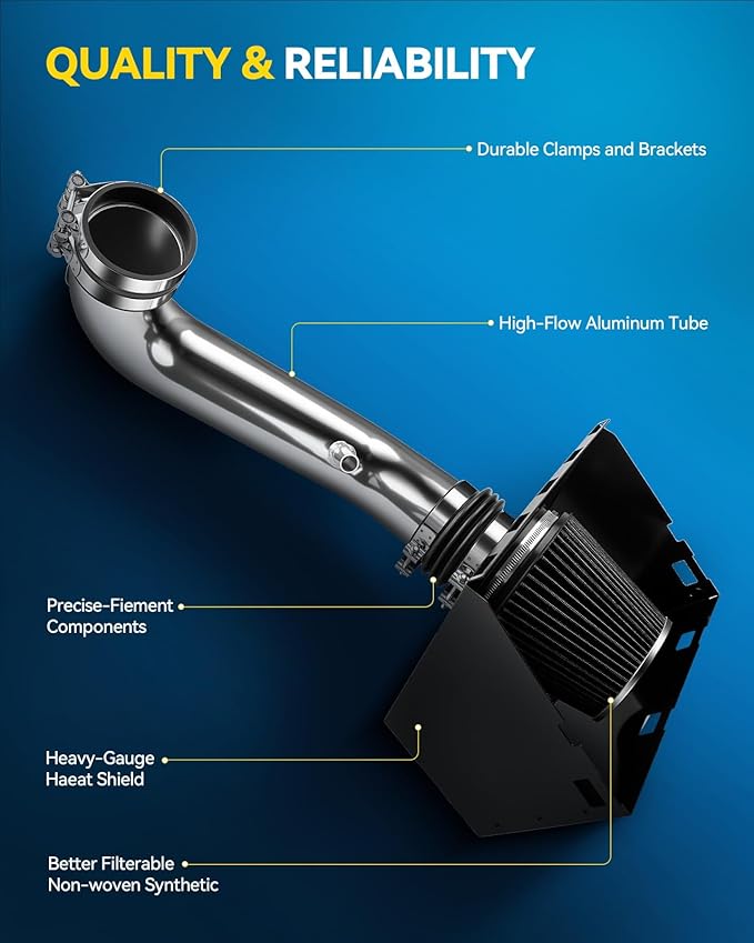 - 【STURDY MATERIAL】 Sturdy aluminum cold air intake kit with filter tubes and custom heat shields, mandrel-bent and powder-coated aluminum intake tubes help increase the amount of air flowing to your engine, while heat shields help protect the intake air from the high temperatures in the engine compartment.