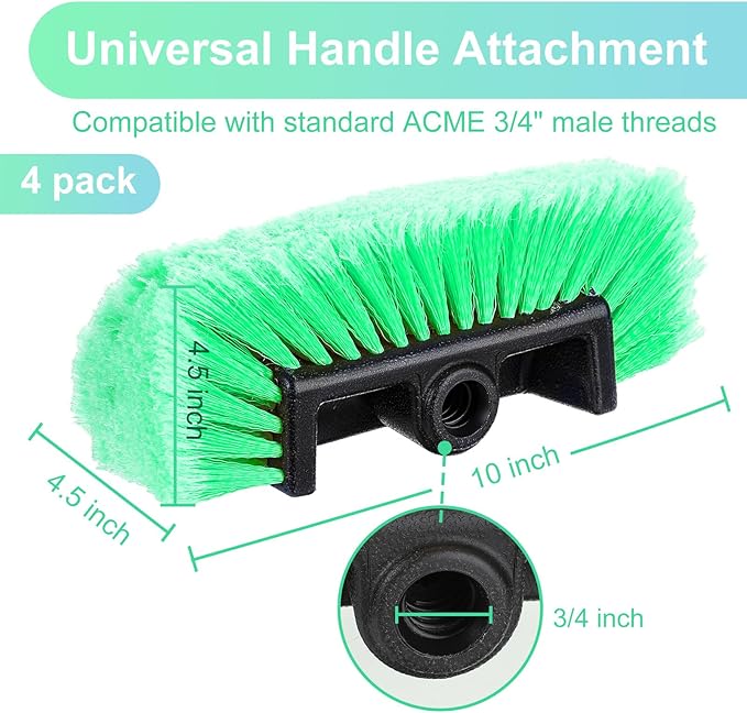 - Proper Size: you will receive 4 car wash brushes; The soft bristles are bright green, enough to meet your daily use and replacement needs; The brush is about 10 inches in size, suitable for most standard 3/4 inch external thread broom handles or extensible brush poles (not included in the supply); Please confirm the size before ordering