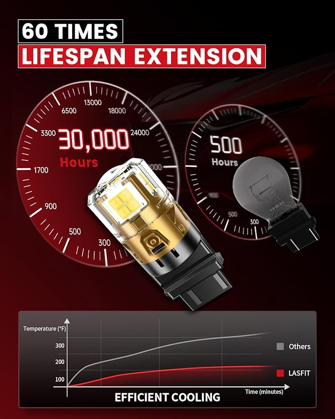 - ๐LASFIT Promise โ Trusted by 1M+ Drivers: The package includes 2ร LASFIT L2 3157 LED bulbs (White). Backed by 1-year replacement and U.S.-based support โ real people who drive and test what we sell. When you choose LASFIT, you choose confidence on every drive. โ ๏ธNote: For turn signal or brake use, add a load resistor or flasher relay to prevent hyper flash
