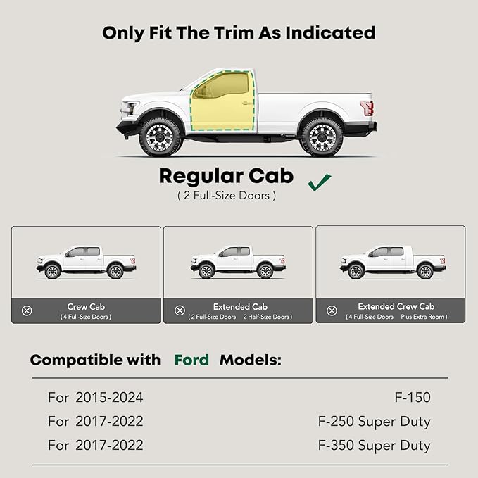- Confident Fitment: Cab length side steps are compatible with the Ford F-150 2015-2024, fit for F-250/F-350 Super Duty 2017-2024, Standard/Regular Cab(2 Full-Size Doors). Our excellent sidebars are long-lasting and will enhance the appearance of your vehicle