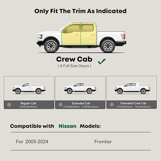 - Confident Fitment: Cab length side steps are compatible with the Nissan Frontier 2005-2024, Crew Cab(4 Full-Size Doors). Our excellent sidebars are long-lasting and will enhance the appearance of your vehicle