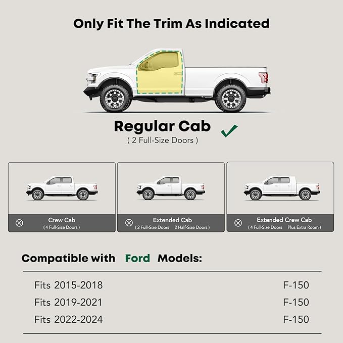 - Confident Fitment: Cab length side steps are compatible with the Ford F-150 2015-2024, Standard/Regular Cab(2 Full-Size Doors). Our excellent sidebars are long-lasting and will enhance the appearance of your vehicle