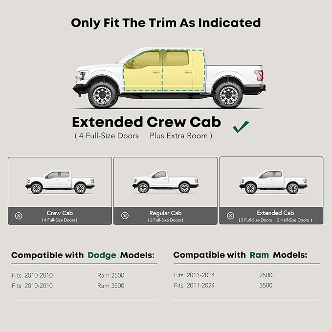 - Confident Fitment: Cab length side steps are compatible with the Dodge Ram 2500 2010-2024, Ram 3500 2010-2024, Extended Crew/Mega Cab(4 Full-Size Doors Plus Extra Room Between the Rears Doors and Truck Bed)