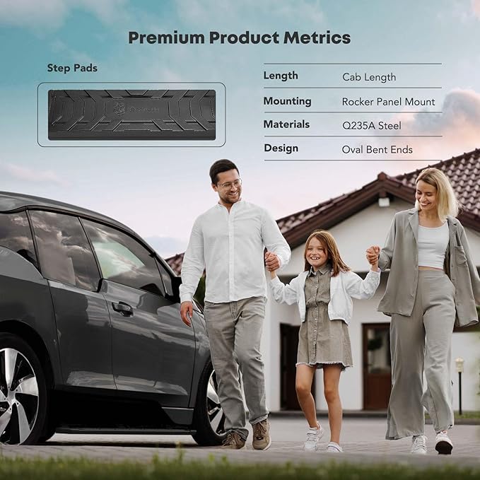 - High-Strength Steel: The step bars are crafted from high-strength Q235A steel and are enhanced with an electrophoretic layer and powder coating. This dual-layer protection greatly improves wear and corrosion resistance, while also imparting a sophisticated appeal