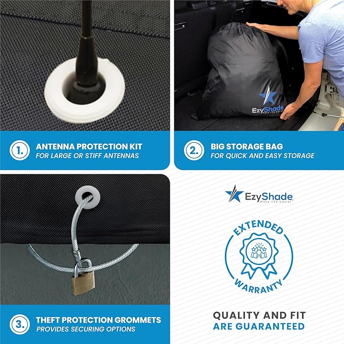 - 100% WEATHER-PROOF. Durable weather-proof materials and heavy-duty reinforced stitching combine with EzyShade’s custom-like fit guarantee to produce a cover that is waterproof, windproof, snowproof, dustproof, 100% sun and UV protective, and scratch resistant.