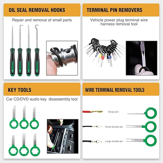 - 【Package Include】- 238Pcs Trim Removal Tool, includes 120 x Car Retainer Clips, 20 x Adhesive Cable Clips, 20 x Plastic Cable Ties, 30 x Sponge Cushion, 11 x Trim Removal Tools, 1 x Trim Clip Removal Pliers, 1 x Car Foil Small Scraper Tool, 2 x Upholstery fastener remover, 4 x Precision hook pick, 11 x Stainless steel stereo removal tools, 18 x Stainless steel Auto Terminal Removal Tool and a portable bag