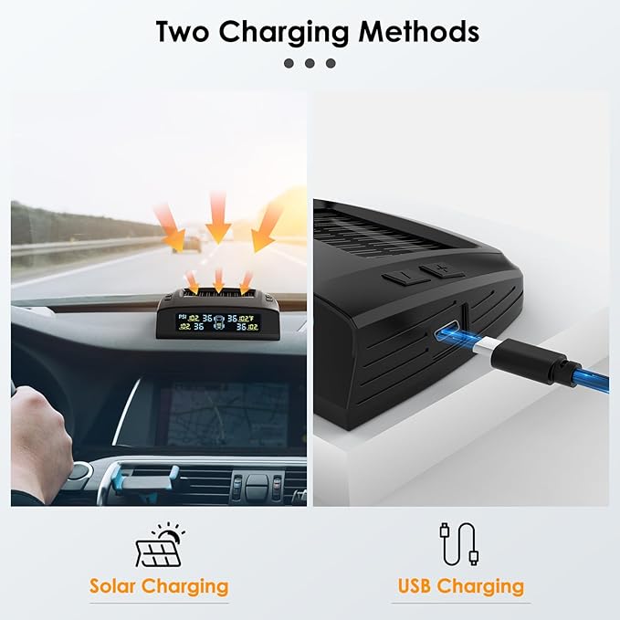 - [Solar Charging and USB Charging]: The Tymate Tire Pressure Monitoring System offers two convenient charging options. Equipped with a solar lithium battery panel, it autonomously charges under sunlight, ensuring continuous battery life. Additionally, it can be supplemented by USB Type C charging when sunlight is unavailable. These dual charging methods enhance the Tymate Tire Pressure Monitoring System M7-3 with 6 External TPMS Sensors, extending its standby time for prolonged usability