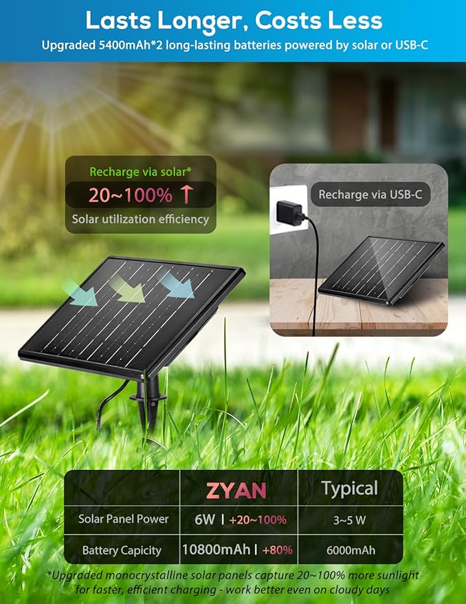 - 【Upgraded 10800mAh for All-Night Lighting】The ZYAN 8 high-brightness spotlights easily illuminate large yards, gardens, and landscapes. Dual upgraded 6W monocrystalline solar panels capture 20% more sunlight for faster, efficient charging, while USB-C backup ensures reliable power on rainy days. Two 5400mAh batteries provide 16~18 hours of lighting from dusk to dawn