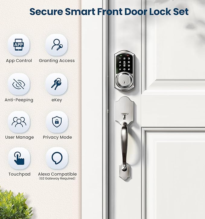- Special Feature : Smart Door Lock with Handleset, Full App Control & ekeys, Touchscreen Keypad Deadbolt, Remote Control with G2 Gateway, Alexa and Google Compatible (Veise G2 WiFi Gateway Required), ANSI Grade 3, Anti-Peeping, Web Portal Management, Fob IC Card, No Extra Drill, Auto Lock Smart Door Lock with Handleset, Full App Control & ekeys, Touchscreen Keypad Deadbolt, Remote Control with G2 Gateway, Alexa and Google Compatible (Veise G2 WiFi Gateway Required… See more