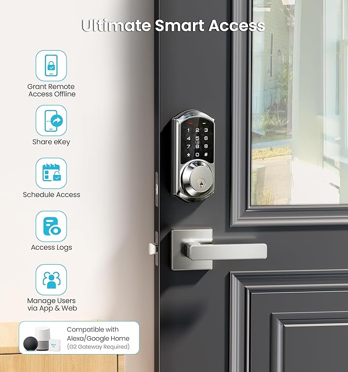 - Special Feature : APP Control & Ekeys, 250+ Passwords & 1000+fobs, Auto-Lock, Easy Installation & Compatible with Apple Watch, Keyless Entry Door Lock with 2 Handle Set, One-Touch Lock, Work with Alexa and Google (G2 Gateway Required) APP Control & Ekeys, 250+ Passwords & 1000+fobs, Auto-Lock, Easy Installation & Compatible with Apple Watch, Keyless Entry Door Lock with 2 Handle Set, One-Touch Lock, Work with Alexa… See more