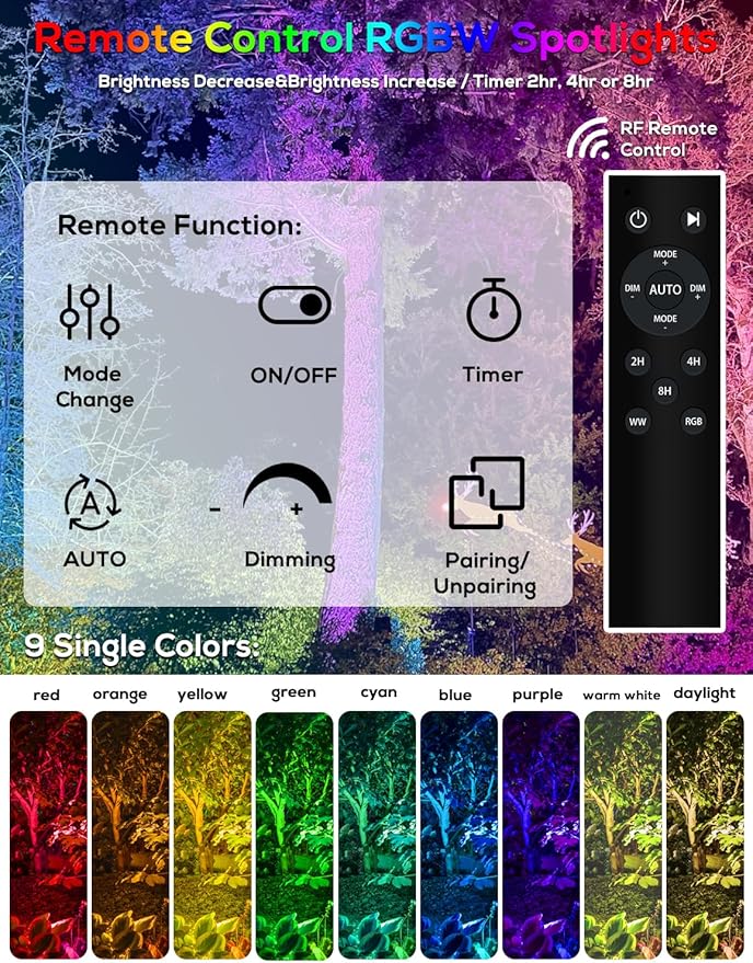 - 【Remote Control, Color & Brightness Adjustment, and Timer Function】Switch between 8 fixed colors or 1 automatic color-changing mode with the included remote control. Effortlessly adjust brightness, change colors, set timers, and switch lighting modes to create dynamic night displays for Halloween, parties, Christmas, New Year, or everyday outdoor ambiance while saving energy