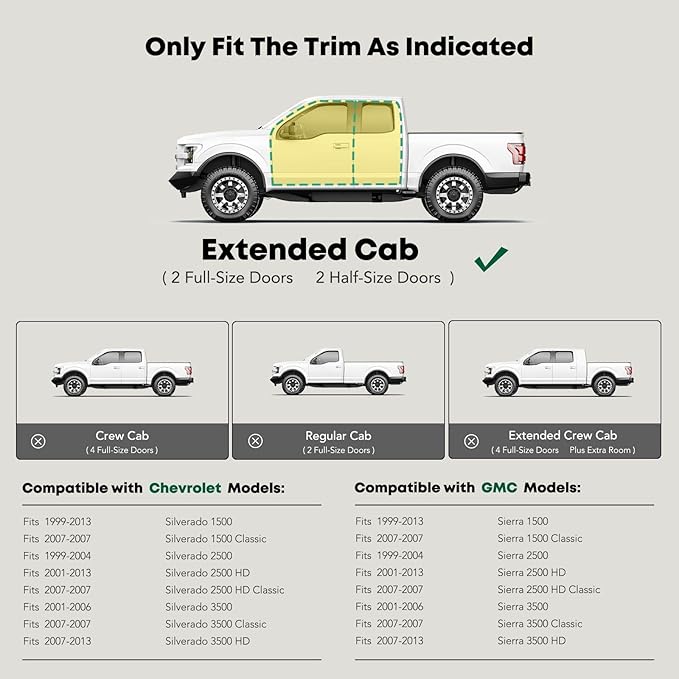 - Fitment: Cab length running boards are compatible with Chevrolet and GMC models: Silverado/Sierra 1500 1999-2013, Silverado/Sierra 1500 Classic 2007, Silverado/Sierra 2500 1999-2004, Silverado/Sierra 2500 HD 2001-2013, Silverado/Sierra 2500 HD Classic 2007, Silverado/Sierra 3500 2001-2006, Silverado/Sierra 3500 Classic 2007, Silverado/Sierra 3500 3500 HD 2007-2013 --- Extended Cab/ Double Cab Pickup (2 Full Size Doors & 2 Narrow Doors)