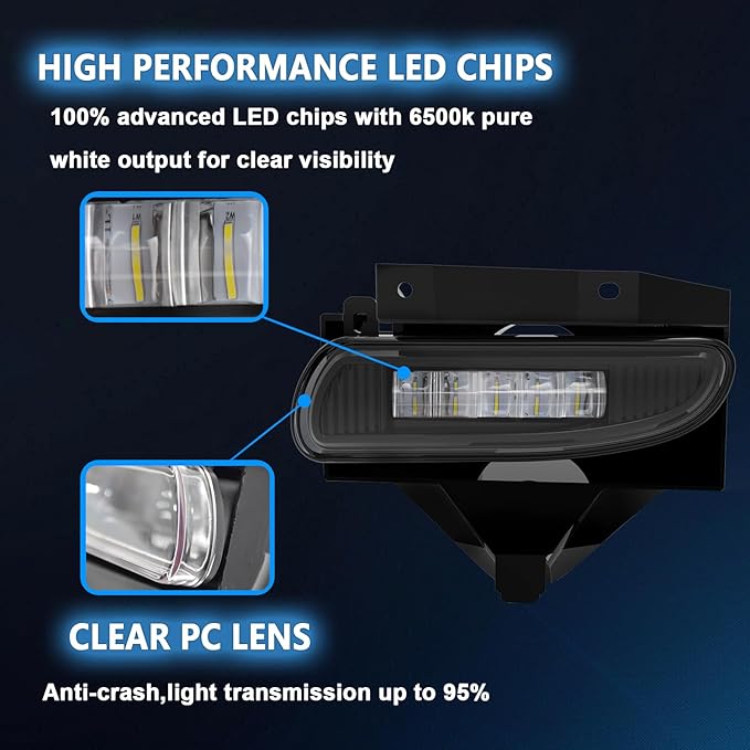 - Advanced LED Technology: Our fog lights feature the newest LED chip design for ultra brightness, delivering a luminous flux of 2500LM and a color temperature of 6500K. Enjoy a lifespan of up to 55,000 hours with lighting that's whiter, brighter, and more penetrating than standard Halogen lamps