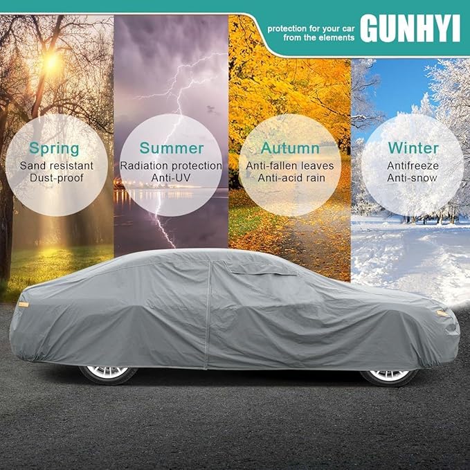 - 【All Weather Protection】GUNHYI heavy duty car cover suitable for indoor and outdoor use, can effectively protect your vehicle from sun, uv-rays, dust, snow, fallen leaves, industrial pollution, bird droppings, pollen, animals, acid rain and extreme weather.