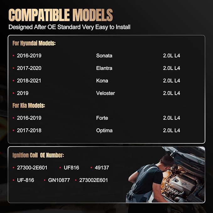 - 【Multivehicle Compatibility】Coil Pack UF816 Compatible with Kia Forte 2016-2019 2.0L L4, Compatible with Kia Optima 2017-2018 2.0L L4, Compatible with Hyundai Sonata 2016-2019 2.0L L4, Compatible with Hyundai Elantra 2017-2020 2.0L L4, Compatible with Hyundai Kona 2018-2021 2.0L L4, Compatible with Hyundai 2019 2.0L L4. For more information about the fit, please check the picture or detail page.