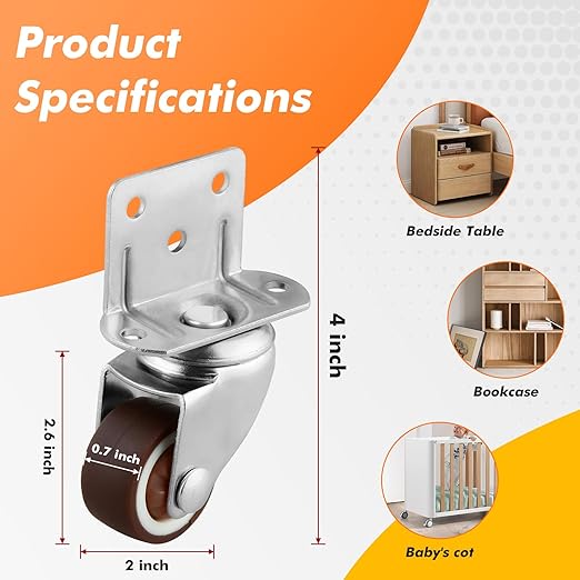 - Premium thermoplastic rubber Materials & 360 Degree Rotation: Each of the 2 inches small caster wheels are made from ant-skid and abrasion resistant materials that are sturdy constructed. You can glide the 2 inches caster wheels effortlessly on both wooden floors and carpet, from corners to a couple of doorways.