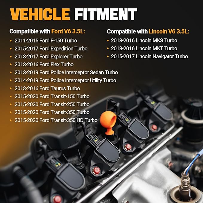 - 【Vehicle Fitment】Ignition coil and spark plugs compatible with V6 3.5 3.5L Turbo. For 2011-2015 Ford F-150, 2015-2017 Ford Expedition, 2013-2017 Ford Explorer, 2013-2016 Ford Flex, 2013-2019 Ford Police Interceptor Sedan, 2014-2019 Ford Police Interceptor Utility, 2013-2016 Ford Taurus, 2015-2020 Ford Transit, 2013-2016 Lincoln MKS, 2013-2016 Lincoln MKT, 2015-2017 Lincoln Navigator