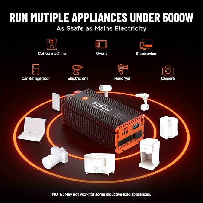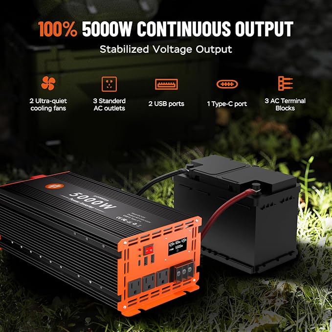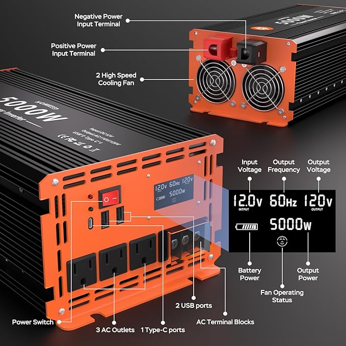 - 【New Upgraded Power Inverter】 Homkeep is a Professional old brand in Inverter. True rated continuous 5000W and 10000W peak power.Convert DC 12V to 110/120VAC tech save more energy from high conversion efficiency (>90%) and low no-load loss.With 4 AC outlets,LCD Display, 2 3.4A USB port and 1 Type-C port. No load draws current 1±0.3A.