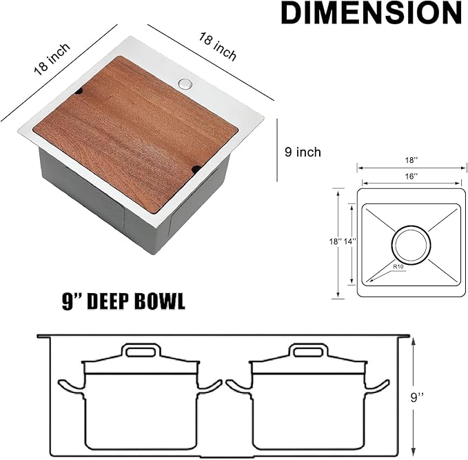 - 【Dimension】Exterior Dimensions: 18"L x 18"W x 9"D. Interior Dimensions: 16"L x 16"W x 9"D. Standard 3-1/2" Drain Opening that fits to the most common garbage.