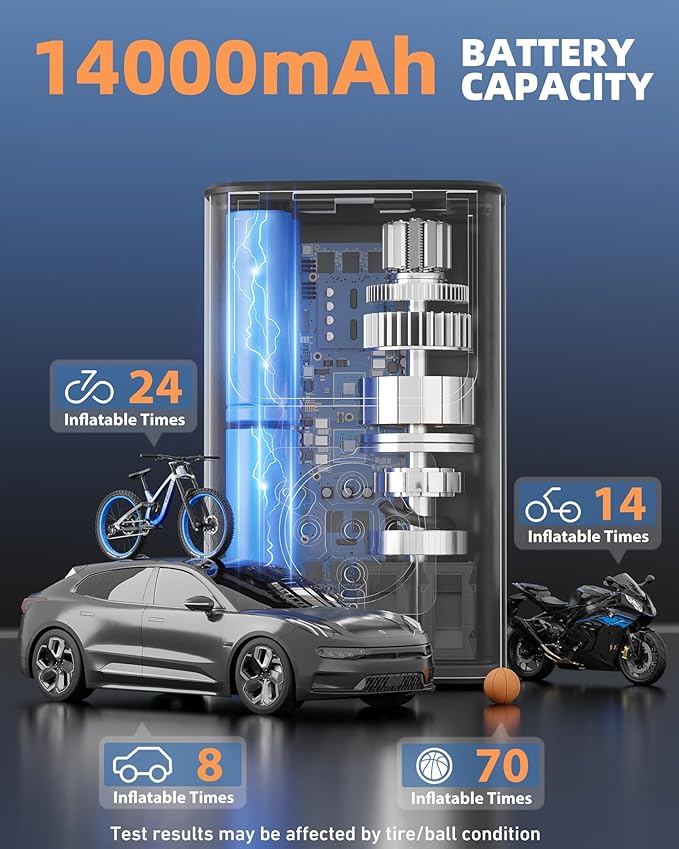 - 【Powerful Output & Faster Inflation】 This Air Compressor powerful motor can provide 150PSI pressure, and 36 L/min air flow. 28-35 tires only need 1min, 0-36PSI only need 5 minutes to fully inflate. With its 5 intelligent modes, it effortlessly caters to a range of inflation tasks. Use with electric bikes, bicycles, motorcycles, cars, balls, and more.